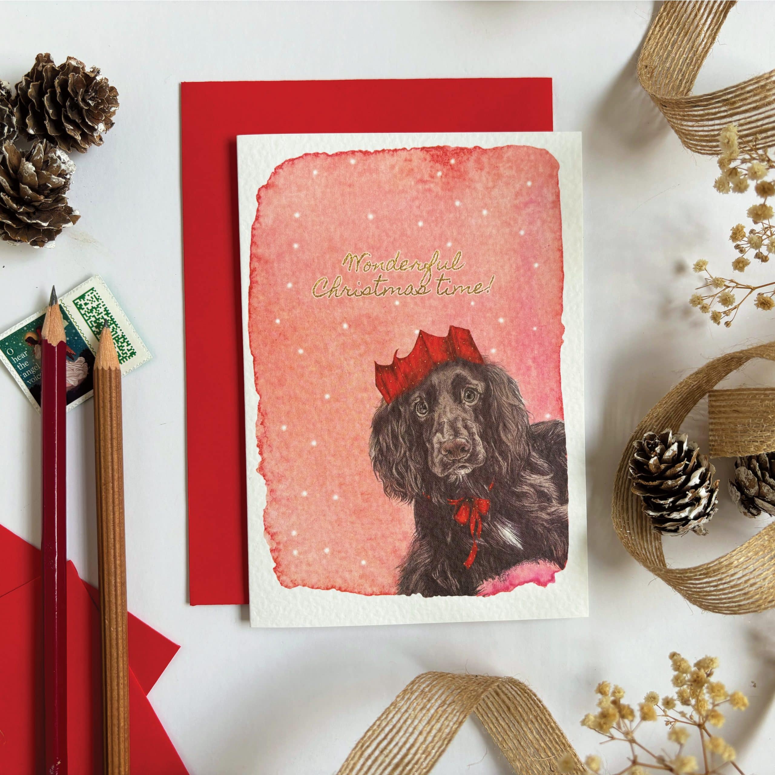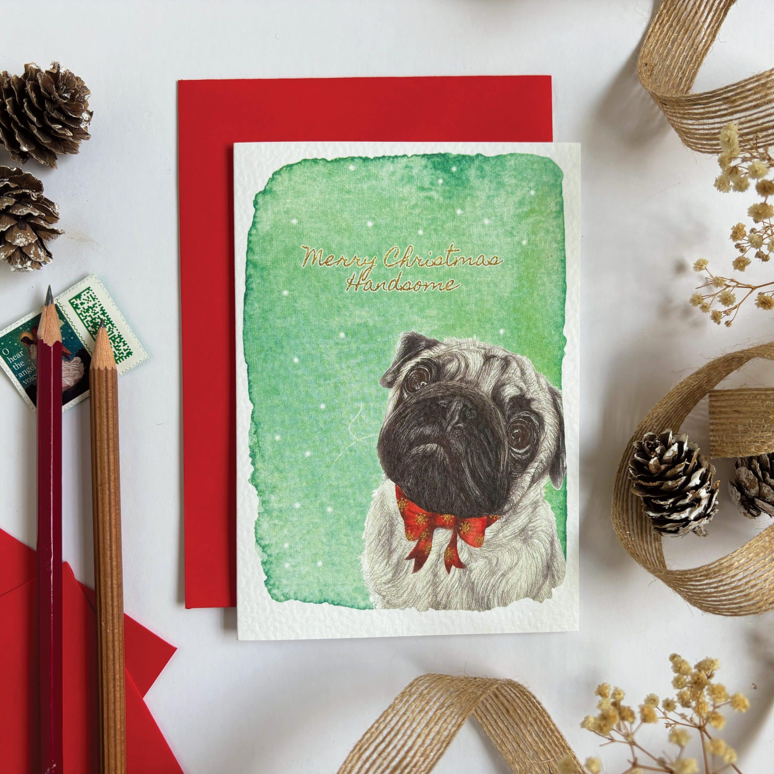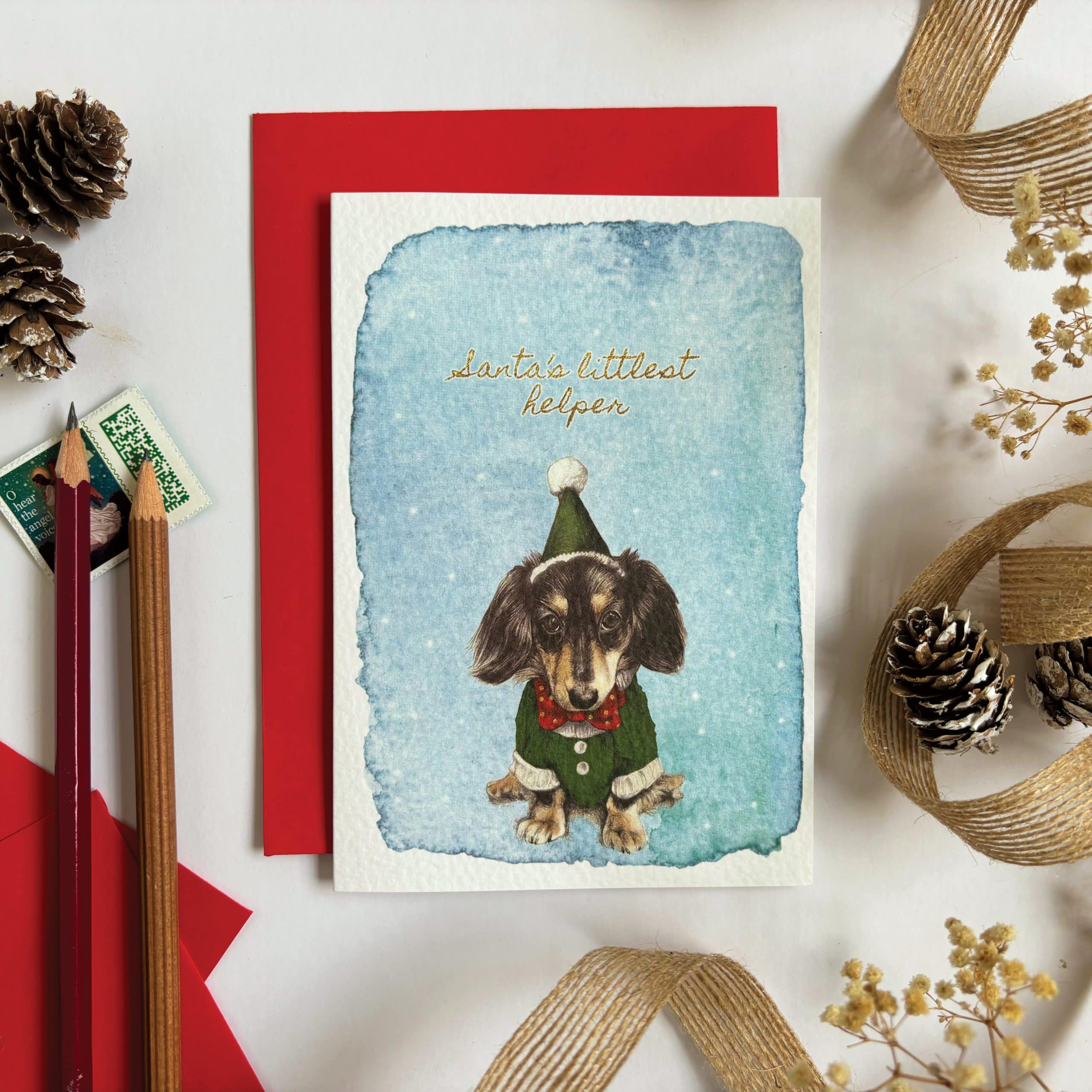 This pack features 2x Harvey the Pug in green, 2x Gus the Spaniel in red, 2x Sancho the Beagle in red and 2x Winston the gorgeous miniature Dachshund in blue all with a snowy background and shining Christmas greetings in gold effect type.